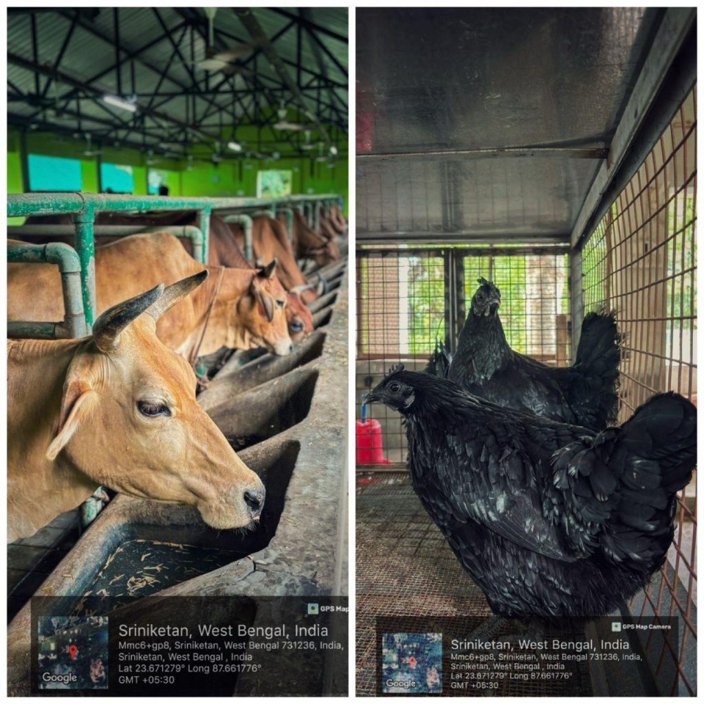 In 1923, Dairy farm was shifted from Santiniketan to Sriniketan and Poultry and Goatery units were added. The Dairy was originally started in 1901 with some cows and buffaloes with the idea that it would not only solve the problem of supplying pure and clean milk to ashrama students but also by taking care of animals themselves, the ashrama students would gain some knowledge of animal husbandry.
